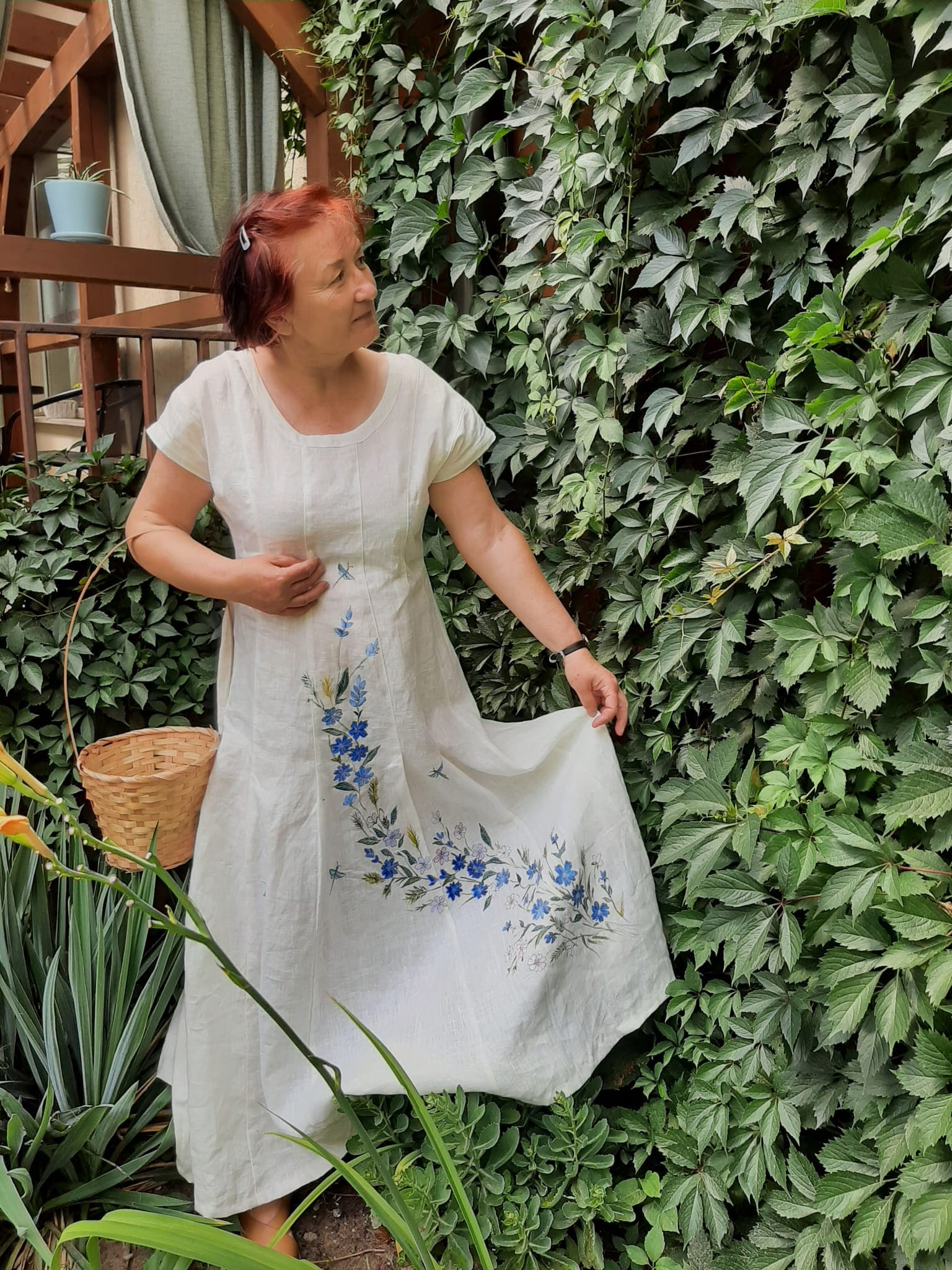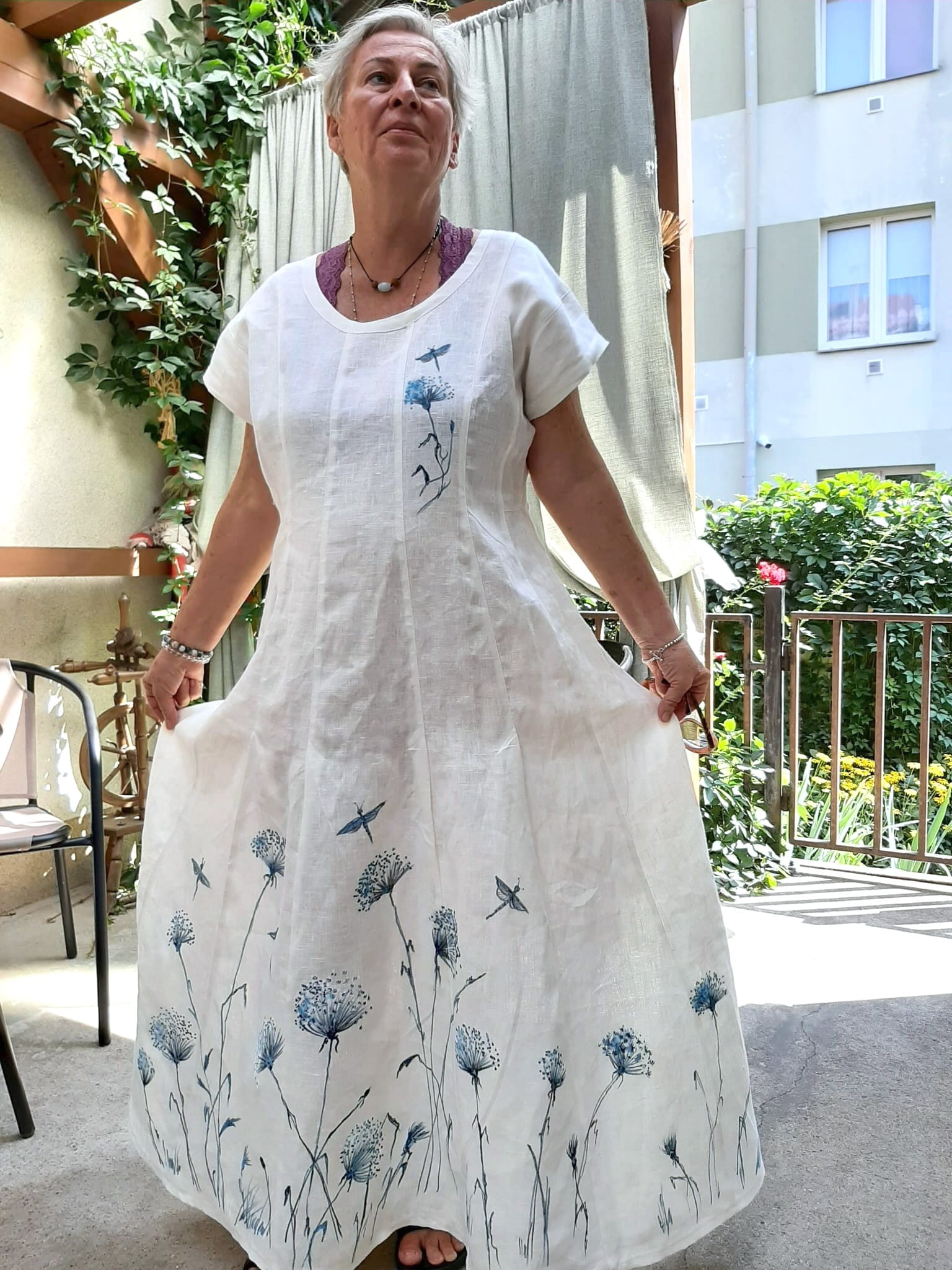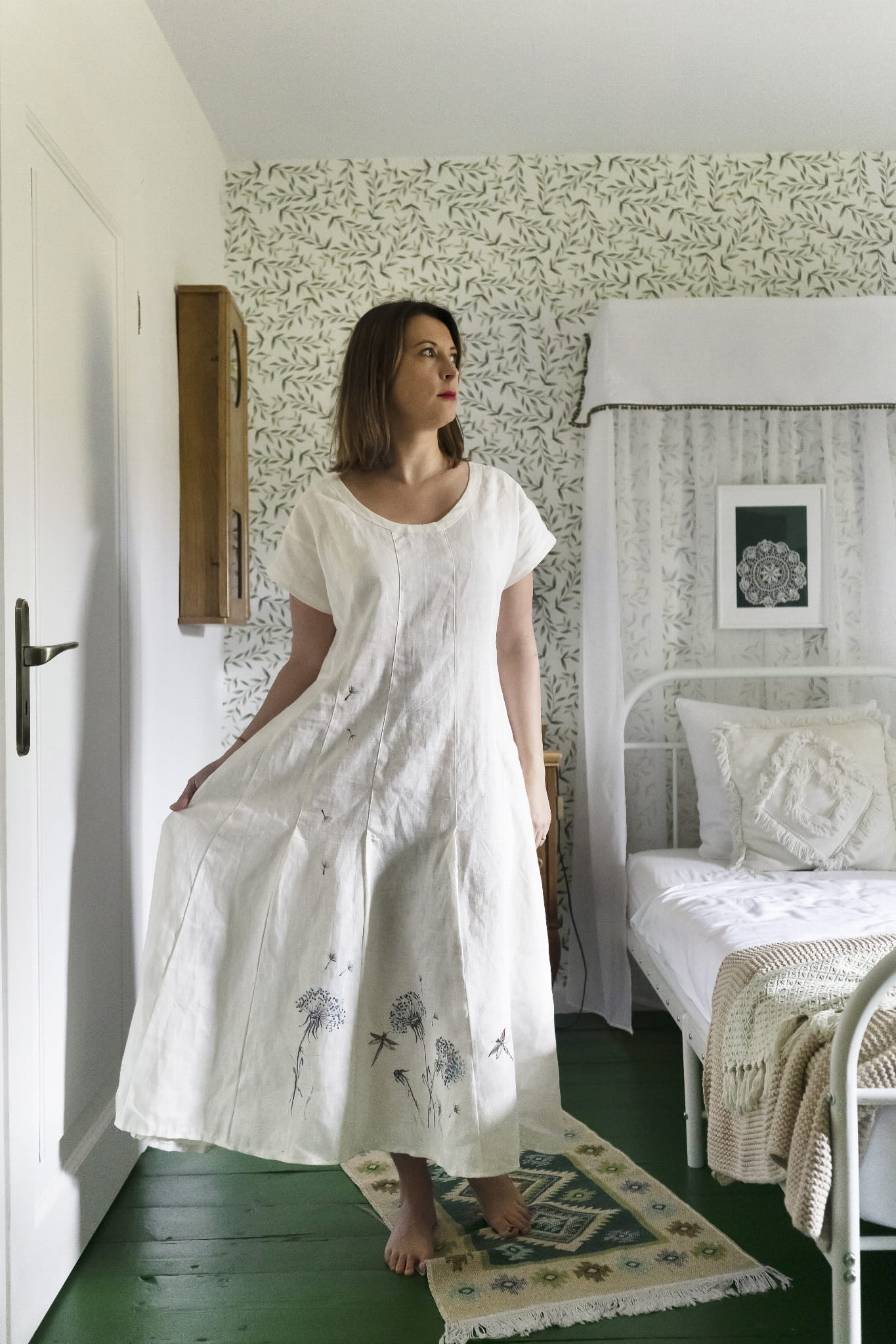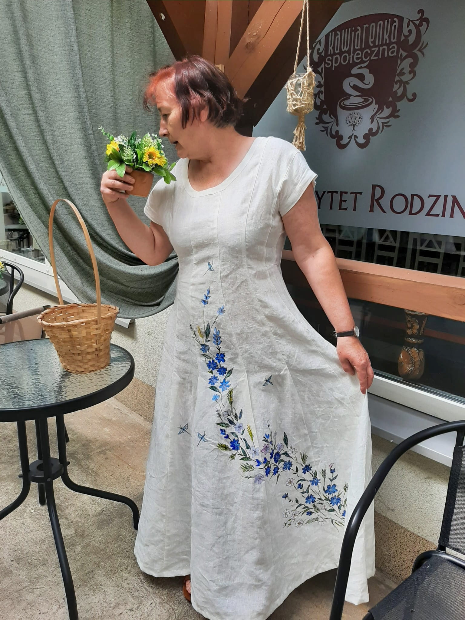 Wyjątkowa sukienka wykonana w 100% z lnu, ręcznie malowana farbami do tkanin. Każda sztuka to unikat stworzony na indywidualne zamówienie. Na zdjęciach prezentowane są modele pokazowe.