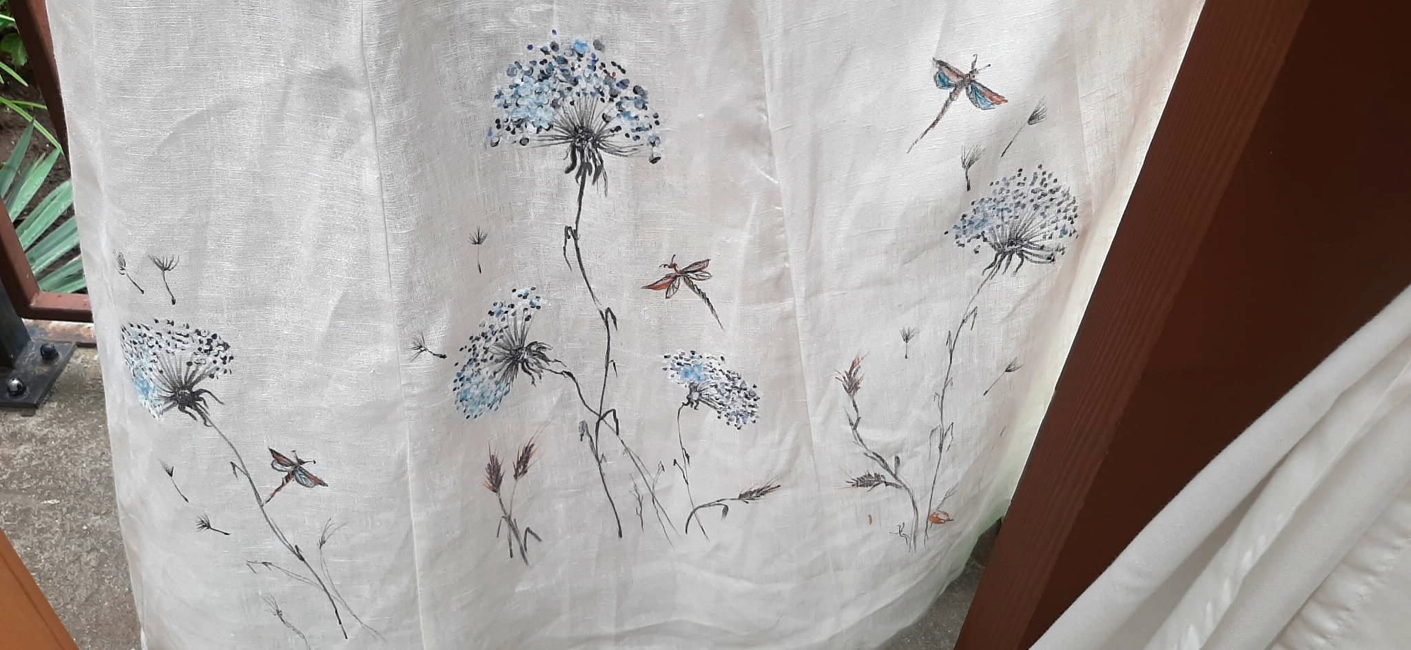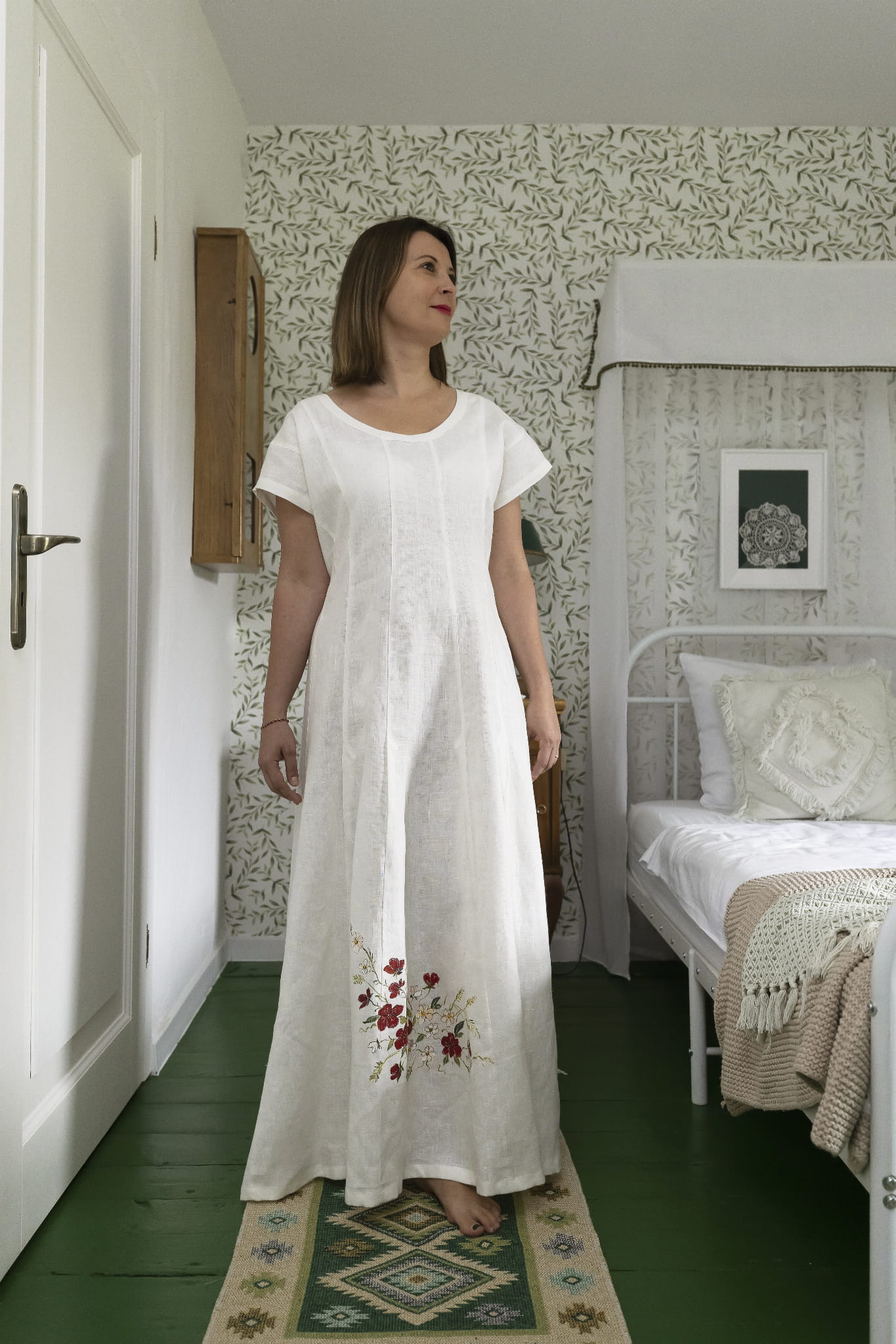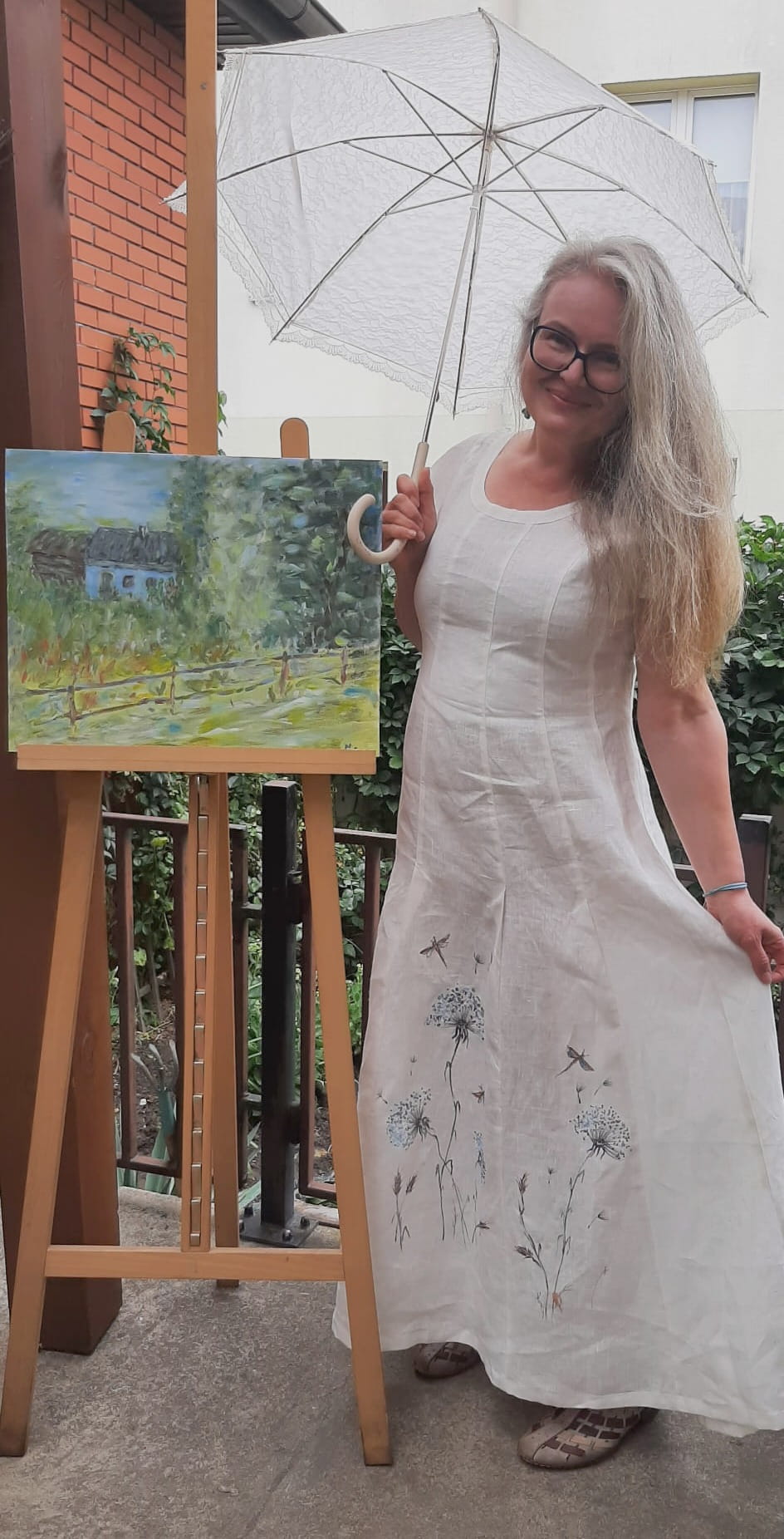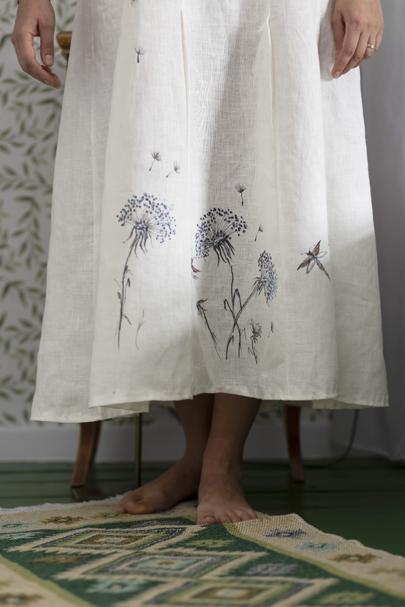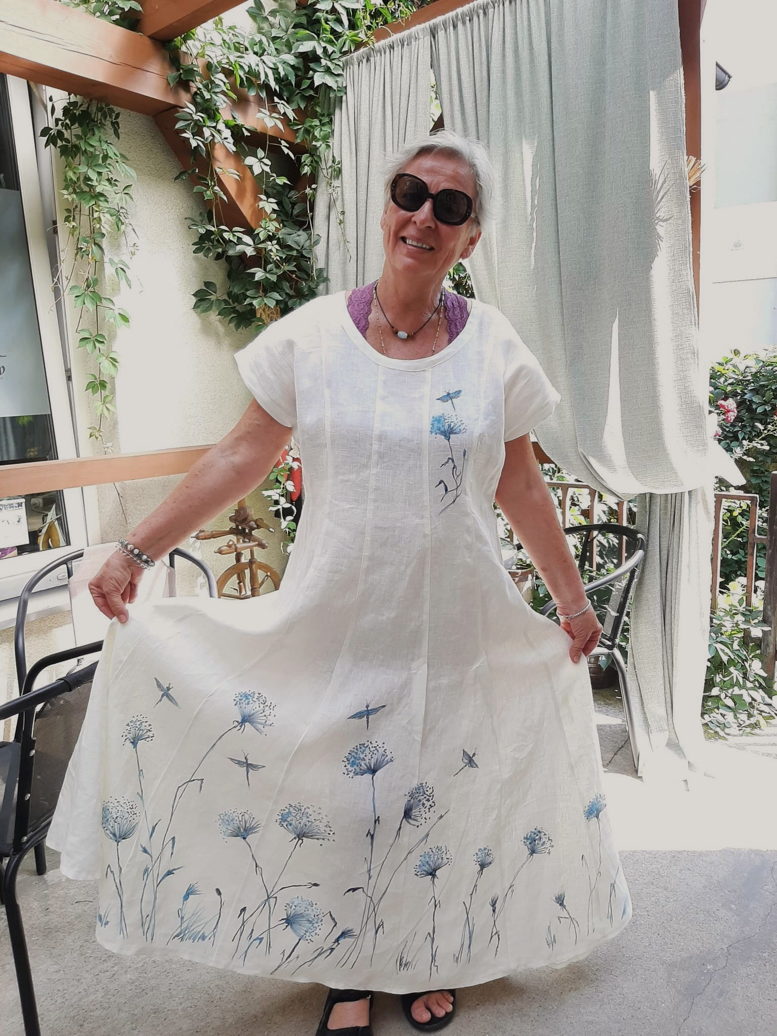 Wyjątkowa sukienka wykonana w 100% z lnu, ręcznie malowana farbami do tkanin. Każda sztuka to unikat stworzony na indywidualne zamówienie. Na zdjęciach prezentowane są modele pokazowe.